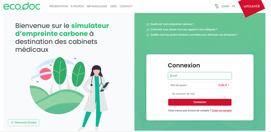 The Ecodoc project ([https://www.eco-doc.ch/], retrieved 8th January 2025) has been developed to provide doctors with a tool that makes it easy to assess the carbon footprint of their practice. All they need to do is enter the general characteristics of the practice (number of staff, medical specialities, type of building, etc.), energy and hot water consumption, staff mobility, patient mobility, subcontracting and consumables.
