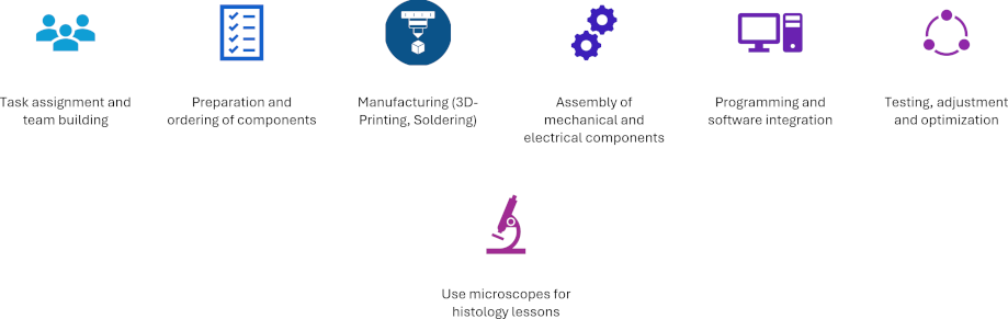 The concept includes theoretical lectures, interactive seminars, and practical laboratory sessions as well as self-study phases and project implementation phases. Students are guided through the technical implementation such as 3D printing, wiring, programming and assembly as well as the use of the microscopes. Key learning objectives include physics, mastering manufacturing processes, and applying open-source resources and finally using their own built microscope within the practical part of a medical lecture. Besides that, the project-based approach should foster methodological competence and problem-solving skills as well as social competences and teamwork.