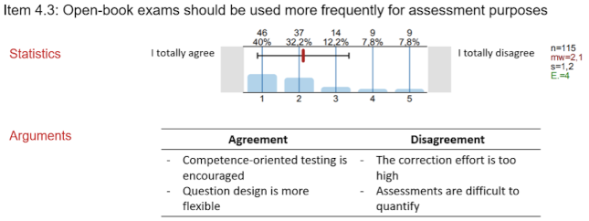 Responses to open-ended questions are analysed according to their function [64] (see table 3 [Tab. 3]). Exploratory questions can be categorised and summarised using either quantitative content analysis [65] or thematic analysis [66]. Questions on extension can be analysed using quantitative content analysis [67]. Evaluating qualitatively recorded arguments in which interviewees justify their quantitative evaluations plays a special role. The five-stage, Argument-based QUalitative Analysis (AQUA) method was developed specifically for this purpose. This method enables qualitative data to be evaluated in a structured way and prepared for feedback alongside quantitative data [68].