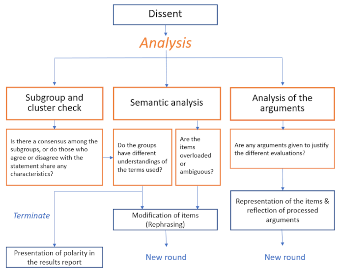 The evaluation strategy depends on the type of data available. Quantitative data is typically analysed using descriptive statistics. For consensus measurement, each item is considered individually and placed into groups based on defined consensus criteria: Consensus of agreement, dissent, or consensus of disagreement.