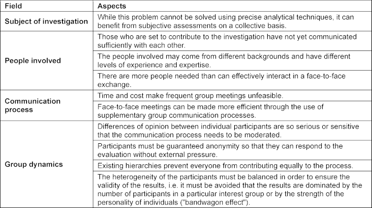 Table 1: Aspects that lead to the application of the Delphi method (based on Linstone & Turoff 1975 [36])