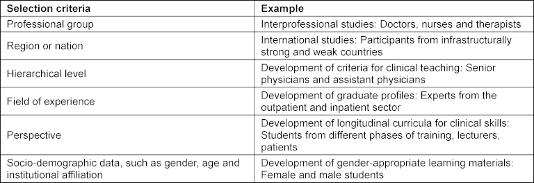 As complete enumeration is generally not possible with Delphi surveys, a sample must be selected. Two factors are particularly relevant to the success of the survey: the respondents' individual expertise in relation to the task and their personal interest in the topic. Targeted selection can significantly reduce dropout rates [50]. The following criteria can be used to proceed systematically: Number of published articles on the subject area in question or publication index, participation in specialist committees, professional role or activities, active participation in relevant networks and forums. Faculties or universities may also be asked to nominate experts in specific subject areas. Students can be recruited via the student council, for example, and patients via self-help groups. The personal contacts and affiliations of the steering group members with relevant networks can be helpful in identifying motivated individuals.