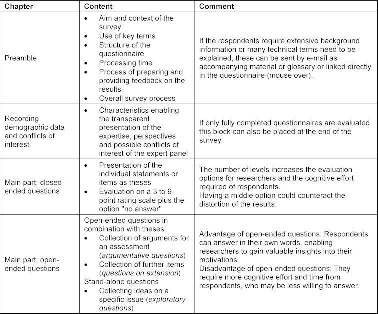 The first Delphi round questionnaire should open with a preamble and collect demographic data. It should also contain a central section comprising both open-ended and closed-ended questions. The scale levels and options for the closed-ended questions must be chosen carefully [28], [59], [61] (see table 3 [Tab. 3]).
