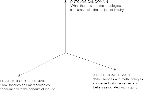 Figure 1: The three domains of theory and methodology. Typically using a theory or methodology from any one domain cannot address the issues and questions associated with other domains. Robust inquiry depends on combining theories and methodologies to be able to cover all three domains.