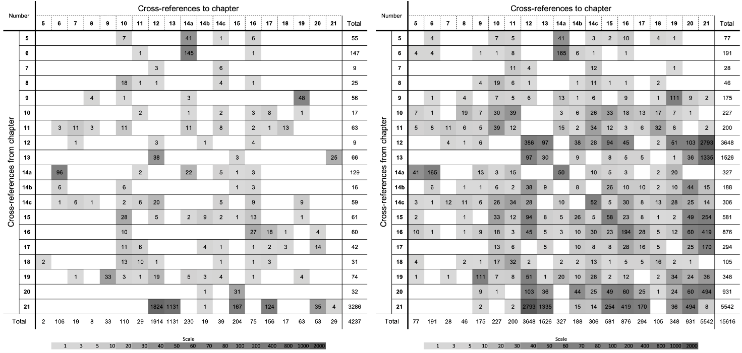 Figure 2: Cross tables of cross-connections between chapters before and after the first intervention, NKLM 1.0 on the left, NKLM 1.0 (neo) on the right