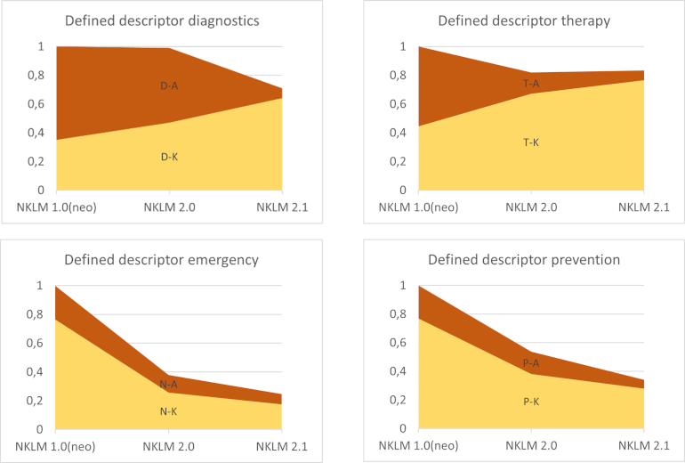 In the case of the descriptors emergency measures and prevention/rehabilitation, there has been a particularly sharp decline in marked descriptors. A likely reason for this is the implicit setting of all descriptors with the competence depth of knowledge in NKLM 1.0 (neo). Apparently, emergency measures and prevention/rehabilitation were less relevant for students after detailed discussion among experts (if there were any emergency or prevention aspects to the respective disease at all).
