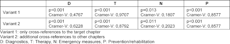 For a better overview, the number of CR is also shown for NKLM 1.0 in figure 5 [Fig. 5]. The number increased across the catalogue versions, but was reduced back below the initial level of NKLM 1.0 by defining the essential CR in NKLM 2.1. At the same time, the congruence of the set descriptors with the assigned CR was gradually increased up to NKLM 2.1. Figure 6 [Fig. 6] shows this for the descriptors with depth A, as only these were explicitly set in NKLM 1.0 (neo) and therefore only these are comparable across all catalogue versions. It can be seen that there were still large gaps in both NKLM 1.0 (neo) and NKLM 2.0, both in variant 1 (only CR to the target chapter) and in variant 2 (additional consideration of CR to other chapters). The results of the chi-square test for all descriptors of the different catalogue versions are shown in table 1 [Tab. 1].