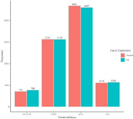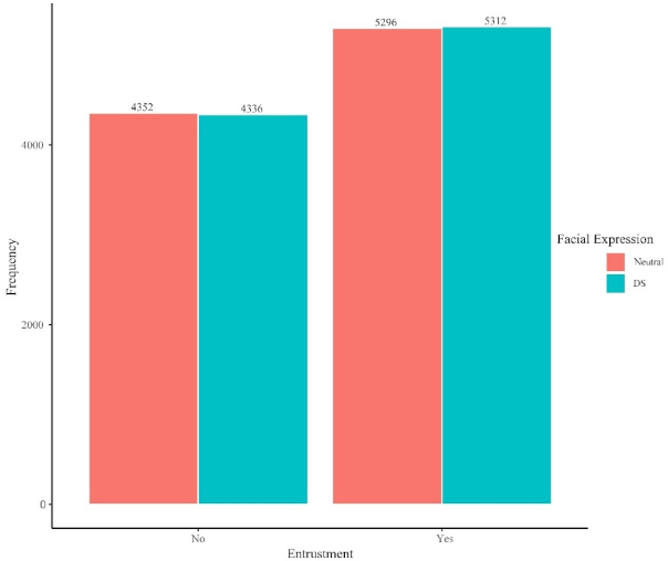 Results: Entrustment and trustworthiness were positively correlated (H1). However, when utilizing mixed-effects models, no significant differences were found between the avatars that displayed a DS and those with a neutral expression regarding positive entrustment decisions (H2) or trustworthiness ratings (H3).