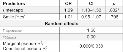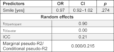 When testing facial expression as a predictor, H3 was not supported – a DS did not increase the assessed trustworthiness positively, as indicated by an OR of 0.97 (95% CI [0.92–1.02], p=.274). Once again, the participants had randomly varying assessments of trustworthiness (τ00participant=0.90), whereas the avatars did not cause any random effects (τ00avatar=0.00). The conditional Pseudo-R2 (0.215) showed that only a small portion of the overall variance in the assessed trustworthiness could be explained by the fixed and random effects that were included in this model. The results for H3 are presented in table 3 [Tab. 3] and illustrated in figure 4 [Fig. 4].