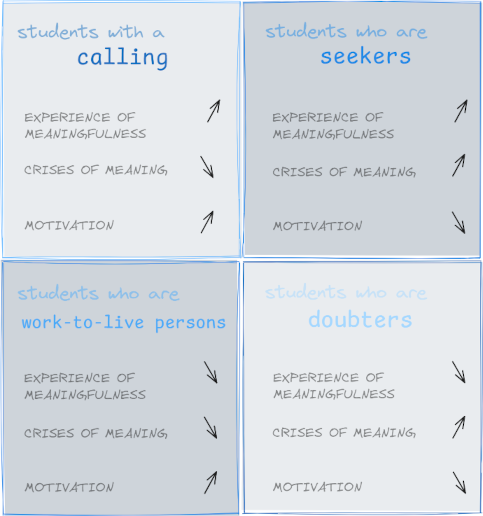 The students reported that experiences of meaningfulness and crises of meaning had an impact on their motivation. Four specific student-types were elaborated, regarding the degree of motivation for their studies and later career entry, in professional meaningfulness and crises: Students with a calling had the strongest motivation and the highest experience of meaningfulness with hardly any crises of meaning. Students who are seekers had a high experience of meaningfulness, but their motivation was low due to crises of meaning, in contrast to students who are doubters, who also had a low experience of meaningfulness. Students who are work-to-live persons, despite low levels of experience of meaningfulness or crises of meaning, showed motivation for their studies and later careers.