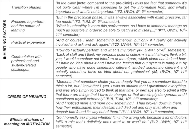 We categorized factors that had a negative impact on the experience of meaningfulness as inhibiting factors on the experience of meaningfulness. In most cases, they provoked a conscious confrontation with questions of meaning or even could trigger a crisis of meaning, which was defined by a crisis-like experience and a conscious confrontation with questions of meaning. Four categories of inhibiting factors could be identified: On the one hand, transition phases, such as the decision to go to university, could lead to a negative or even crisis-like experience, as these were often accompanied by a “lack of orientation” (#3) and “fear of the future” (#3). Furthermore, transitions into new phases of education were characterized by specific uncertainties. For example, learning strategies no longer worked after the first part of the medical state examination (“Physikum”) due to the increased amount of material.