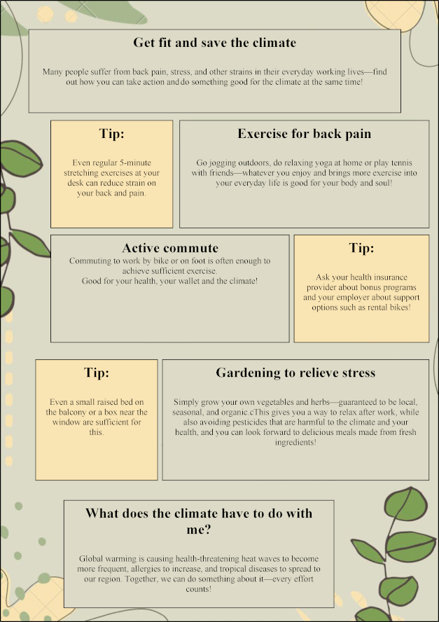 The students in the small group organize themselves to create a healthcare-related communication product and can work digitally or in person. Up to six sessions of 45 minutes each are allocated in the timetable of the curriculum for this purpose. A case vignette illustrates a healthcare or problem situation in a general practitioner's office. To solve the problem, students are asked to create a communication product collaboratively. For example, they are to create a flyer explaining the planetary health diet to unburden the limited consultation time (see figure 4 [Fig. 4]). All resources, including the use of artificial intelligence, are permitted for this task. The purpose of this session is to apply CSHC to a product actually used in general practices, employing motivational communication techniques.