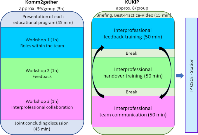 The IP teaching unit was divided into two sections (see figure 1 [Fig. 1]). In the first part of the teaching unit (Komm2gether), theoretical foundations were established, and participants were sensitized to the topic. In the second part (KUKIP), practical training session in small IP groups were conducted based on the contents previously taught.