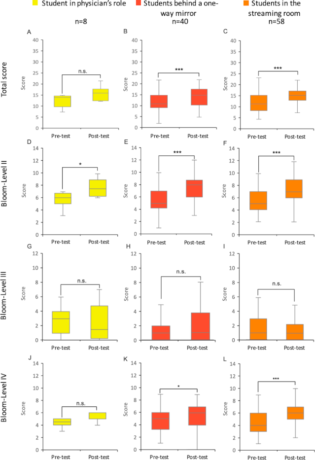 At Bloom level II, all subgroups showed a significantly increased score between the pre- and the post-test (physician role: n=8, p<0.05, r=0.79, Mdpre=6, Mdpost=7.5; behind the one-way mirror: n=40, p<0.001, r=0.62, Mdpre=5, Mdpost=8; in the streaming room: n=58, p<0.001, r=0.59, Mdpre=5, Mdpost=7). At level IV, both the students behind the one-way mirror (n=40, p<0.05, r=0.36, Mdpre=5, Mdpost=6) and those in the streaming room (n=58, p<.001, r=0.44, Mdpre=4, Mdpost=6) recorded a significant increase (see figure 4 [Fig. 4]).