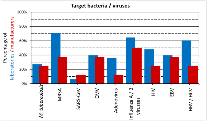 The pathogens most frequently analysed in more than half of the laboratories are MRSA, influenza A and B viruses and HBV/HCV, followed by HIV, EBV, CMV and adenovirus detected in about 40% of the laboratories. M. tuberculosis was mentioned as target by 27% of the end-users. Apart from these pathogens, which were explicitly listed in the questionnaire as multiple choice option, Chlamydia trachomatis, norovirus and Neisseria gonorrhoeae are also frequently (in 20% to 40% of the laboratories) analysed.