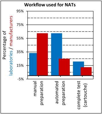 Figure 5: Comparison of different workflows applied for NATs based on responses of analytical laboratories (blue bars) and manufacturers (red bars)