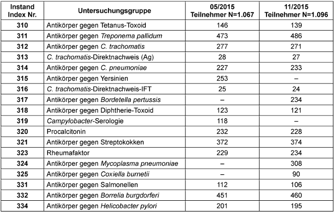 An den zwei Ringversuchsdurchläufen von INSTAND e.V. haben jeweils im Frühjahr und im Herbst des Jahres 2015 durchschnittlich 1.082 Laboratorien teilgenommen. Dieses Kollektiv setzte sich aus durchschnittlich 832 Teilnehmern aus Deutschland und 250 Teilnehmern aus dem europäischen Ausland zusammen. Die Teilnehmerzahl für die einzelnen Parameter lag mit 24 am niedrigsten für den Chlamydia trachomatis-IFT-Direktnachweis (Nov. 2015) und am höchsten für die Lues-Serologie mit 486 (Nov. 2015) (vgl. Tabelle 1 [Tab. 1]).