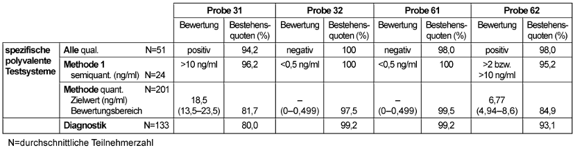 Die Ringversuchsbeurteilung erfolgte auch für diesen Parameter methodenabhängig. Hierfür wurde der robuste Mittelwert jeder Methode an Hand der Teilnehmerergebnisse ermittelt und bei den positiven Proben 32 und 62 ein Bewertungsbereich von ±27% um den methoden-abhängigen Zielwert festgesetzt. Für qualitative Analysen wurde der Modalwert der Referenzlaboratorien eingesetzt. Im Fall der negativen Proben wurde ein Bewertungsbereich von 0 bis zum Cutoff-Wert von <20 IU/ml definiert. Die Zielwerte, Bewertungsbereiche und Bestehensquoten für die einzelnen Proben wurden in Tabelle 14 [Tab. 14] dokumentiert.