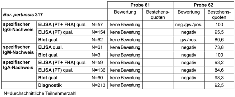 Probe 61 wurde von einem kommerziellen Anbieter zugekauft und wies im Teilnehmerkollektiv sehr widersprüchliche Befunde auf, so dass sie im Sinne der Ringversuchsteilnehmer aus der Bewertung genommen wurde. Die Probe 62 stammte aus der Blutspende eines gesunden und wissentlich gegen den Erreger B. pertussis geimpften Spenders ohne anamnetisch belegten, respiratorischen Infekt und enthielt keine messbaren spezifischen Antikörperreaktivitäten gegen Pertussis-Toxin (PT).