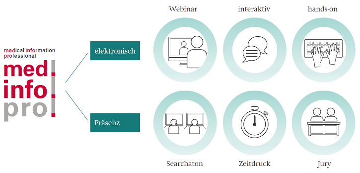 med.info.pro consists of the electronic component webinar that presents the course content as well as a classroom event in order to assess performance. We called this session “Searchaton”, which should emphasise the playful nature of the event. In a competition evaluated by a jury, the students apply what they have learned in the webinar under time pressure.