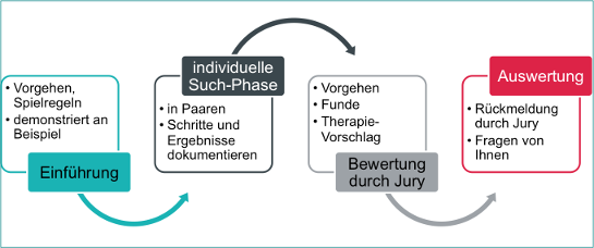 Beim zweiten, fallbasierten Teil sollte es auf kooperatives Arbeiten und Recherche unter Zeitdruck ankommen. Hier entschieden wir uns für ein Präsenzformat mit Online-Nachbetreuung. Diese zweite Untereinheit ist durch einen Gamification-Ansatz gekennzeichnet und erhielt den selbstgebildeten Namen Searchaton (search + -athon wie in Marathon, ähnlich wie beim Eventformat Hackaton, vgl. [13]). Der Aufbau ist in Abbildung 1 [Abb. 1] dargestellt. Ein erläuterndes Info-Video ist auf https://www.med-info-pro.unibas.ch verfügbar.