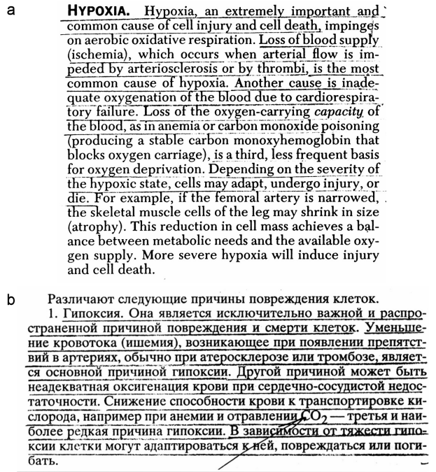 Abbildung 2: Fehlerhafte Übersetzung eines Lehrbuches der Pathologie [12]. Ein Absatz aus diesem (a) reproduziert (b) in einem russischen Lehrbuch [13]. Der wortwörtlich übersetzte Text ist unterstrichen. Carbon monoxide (a) wurde allerdings als CO2 übersetzt (b).