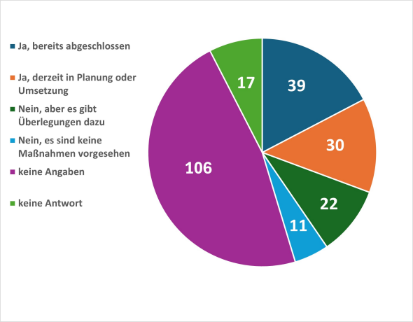 Wie Abbildung 3 [Abb. 3] zeigt, sind mindestens 102 der teilnehmenden Bibliotheken an eine Zentralbibliothek angegliedert oder die Umfrage wurde direkt durch die Zentralbibliothek beantwortet. Von diesen 102 Einrichtungen fanden an 39 Bibliotheken Umbaumaßnahmen statt, die bereits abgeschlossen sind. An 30 Bibliotheken sind Maßnahmen geplant oder werden bereits umgesetzt, an weiteren 22 Bibliotheken gibt es zumindest Überlegungen dazu. Lediglich 11 Zentralbibliotheken planen keine Umbaumaßnahmen zur Verbesserung des Lernortes. Die meisten Teilnehmenden (106) haben keine Angaben zu durchgeführten oder angedachten Umbaumaßnahmen gemacht. Vermutlich handelt es sich um Fachbibliotheken oder sonstige Einrichtungen, die keiner größeren Zentralbibliothek zugeordnet sind.