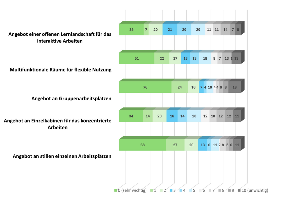 Der klassische stille Einzelarbeitsplatz hat immer noch die größte Bedeutung und darf in keinem Konzept zugunsten offener Lernumgebungen vernachlässigt werden. Sollte die Vermutung nahe liegen, dass damit auch ein hoher Bedarf an Einzelkabinen für das konzentrierte Arbeiten erwartet wird, bestätigen die Angaben diese Vermutung nicht. Vielleicht liegt es daran, dass die Einzelkabinennutzung meist an das Anfertigen einer Abschlussarbeit gebunden ist und der Bedarf dafür – in Relation zur Prüfungsvorbereitung im stillen Lesesaal – geringer ausfällt. Der Bedarf an Gruppenarbeitsplätzen erfährt den höchsten Zuspruch und belegt den Trend, dass sich das studentische Lernen mehr zum gruppen- und projektorientierten Arbeiten verlagert hat und es damit einen großen Bedarf an Räumen zum belebten Austausch und zur Interaktion gibt. Die Einrichtung offener Lernlandschaften mit modernen und flexiblen Möbeln zum interaktiven Arbeiten stellen meist das Kernstück in den Konzepten zur Lernortentwicklung dar. Obwohl Austausch und Interaktion auch in einer offenen Lernlandschaft möglich ist, wurde dieser Option die geringste Bedeutung zugesprochen.
