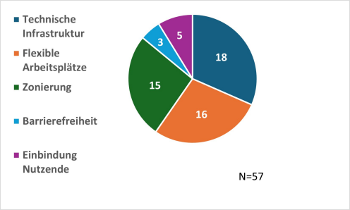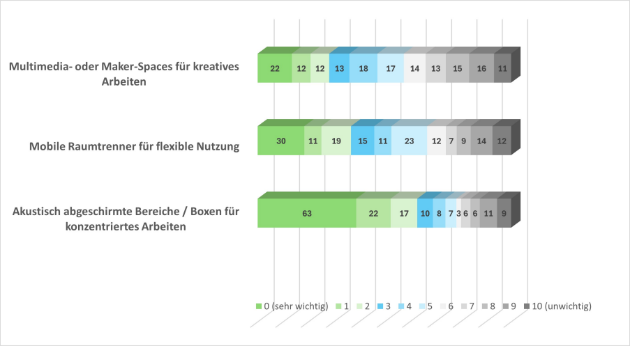 Abbildung 7 [Abb. 7] zeigt: Klarer Favorit der „Raum-in-Raum“-Konzepte sind die akustisch abgeschirmten Bereiche, die ein konzentriertes Arbeiten ermöglichen sollen. Mobile Raumtrenner und Bereiche für das kreative Arbeiten wie Makerspaces wurden dagegen durchschnittlich als weniger bedeutsam angesehen. Die Antwort belegt scheinbar den Trend, dass die größte Bedeutung den stillen Arbeitsplätzen beigemessen wird.