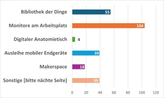 Bei Abbildung 8 [Abb. 8] ist zu berücksichtigen, dass mehrere Antworten ausgewählt werden konnten, die in Frage 10 dann wiederum frei ergänzt werden konnten. Die meisten Nennungen gab es für „Monitore am Arbeitsplatz“ (104), an zweiter Stelle kommt die “Bibliothek der Dinge” (55 Nennungen), gleichauf sind die „Ausleihe mobiler Endgeräte“ und Sonstige (39 Nennungen), Makerspaces bieten 18 Teilnehmende an und lediglich viermal wurde der digitale Anatomietisch genannt.