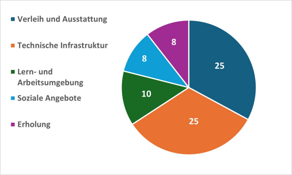 Der Verleih von Ausstattung und Materialien (25 Antworten) umfasst die Ausleihe von technischer Ausstattung wie Ladekabel, Kopfhörer, Laptopständer, Präsentationstechnik und sogar VR-Brillen. Solche Angebote unterstützen die Studierenden im täglichen Bibliotheksbetrieb durch die Bereitstellung von Arbeitsmaterialien, die über den Medienbestand hinausgehen. Ebenfalls 25 Antworten entfielen auf den Bereich technische Ausstattung und Infrastruktur. Antworten in dieser Kategorie erwähnten den Zugang zu fortschrittlicher technischer Infrastruktur, darunter Podcast- und Filmstudios, höhenverstellbare Tische, Multimedia-Räume und Aufsichtscanner. Solche Angebote erweitern die Funktionalität der Bibliotheken als vielseitige Lern- und Arbeitsorte. Zu den 10 Antworten im Bereich Lern- und Arbeitsumgebung gehören spezialisierte Arbeitsplätze, wie etwa für sehgeschädigte Nutzende oder Eltern mit Kind, sowie individuelle Rechercheberatungen. Diese Angebote sind auf die spezifischen Bedürfnisse unterschiedlicher Nutzungsgruppen zugeschnitten. Die sozialen und unterstützenden Angebote mit 8 Antworten umfassen Sprachcafés, De-Stress-Stationen und soziale Beratungsdienste, die darauf abzielen, das soziale und emotionale Wohlbefinden der Studierenden zu fördern. Angelehnt daran wurden mit 8 Antworten auch Erholungsangebote genannt, wie Cafeterias, Loungebereiche und Gemeinschaftsgärten, die den Studierenden Möglichkeiten zur Entspannung und sozialen Interaktion bieten. Diese Vielfalt an Angeboten unterstreicht den ganzheitlichen Ansatz moderner Bibliotheken, die neben dem klassischen Medienbestand zunehmend als multifunktionale Zentren der Unterstützung und des Austauschs fungieren.