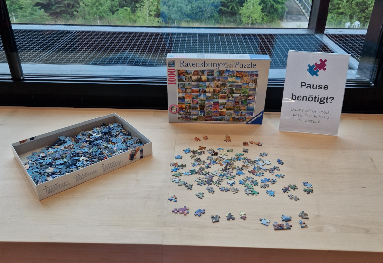 Unter dem Titel „Building Community Engagement“ wurden daneben auch inspirierende Praxisbeispiele vorgestellt, wie Bibliotheken die soziale und emotionale Gesundheit ihrer Nutzenden sowie ihrer Beschäftigten fördern können. Besonders eindrucksvoll war der Beitrag aus Turku (Finnland), wo „Board Game Nights“ zu einem festen Bestandteil der studentischen Kultur geworden sind. In Oxford wiederum setzt man auf niederschwellige Angebote für Mitarbeitende und Studierende – von Puzzles und Malbüchern bis zu Spaziergängen und Buchclubs. Diese Vielfalt an Ideen verdeutlicht, wie breit das Spektrum bibliothekarischer Community-Arbeit heute gefasst werden kann und wird. Auch hier konnten wir von den Kolleginnen und Kollegen aus dem Ausland dazulernen und haben die Idee sofort nach Rückkehr in unserer eigenen Bibliothek umgesetzt (Abbildung 1 [Abb. 1]) – sehr zur Freude unserer Studierenden und Mitarbeitenden, die nun auch in Augsburg ihre Mittagspause puzzelnd verbringen können.
