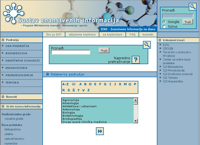 In der zweiten Hälfte des Jahres 2004 wurde das System ZIND (Abbildung 1 [Abb. 1]; http://zind.szi.hr) entwickelt und veröffentlicht. Hauptziel war es, zahlreiche wissenschaftliche Informationsquellen für die Endnutzer zugänglich zu machen. ZIND wurde als Subject Gateway konzipiert, das einen einfachen Zugang zu unterschiedlichen multidisziplinären wissenschaftlichen Quellen und Dienstleistungen ermöglicht. Besondere Aufmerksamkeit wird kroatischen Informationsquellen gewidmet.
