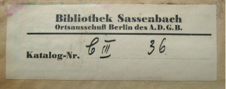 Abbildung 10: Auf der Innenseite des Buches: Inventaretikett des ursprünglichen Besitzers: Bibliothek Sassenbach: Ortsausschuss Berlin des A.D.G.B.