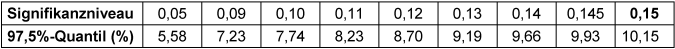 Tabelle 3: 97,5%-Quantil der Verteilung des empirischen Fehlers 1. Art der Testprozedur ABed15 für verschiedene Signifikanzniveaus des Tests auf einen von Null verschiedenen Effekt in der ZP (Trainingsdaten)