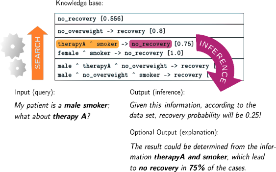 Selbständig lernende Systeme haben häufig einen Blackbox-artigen Charakter: Hat ein System ein bestimmtes Verhalten gelernt, ist es oft schwierig, das gelernte Wissen in kompakter, menschenlesbarer Form zu explizieren. In kritischen Anwendungen (wie etwa in der Medizin) kann diese Problematik dazu führen, dass die mangelnde Vertrauenswürdigkeit solcher Systeme ihrem Einsatz im Wege steht. Methoden der Wissensrepräsentation [6] (ein traditionelles Teilgebiet der KI) können hier Abhilfe schaffen, da bei wissensbasierten Systemen regelhaftes Wissen zumeist in expliziter Form vorliegt und verarbeitet wird: So können beispielsweise einzelne oder mehrere Regeln identifiziert werden, auf Basis derer eine Entscheidung getroffen wird (etwa im Gegensatz zu neuronalen Netzen, bei denen das Wissen implizit in zahlreichen numerischen Gewichten enthalten ist, die nur schwer Rückschlüsse auf deren inhaltliche Bedeutung zulassen, und somit substanzielle Erklärungen für eine Entscheidung häufig schwer oder gar nicht geliefert werden können). Die Funktionsweise unterscheidet sich somit auch grundsätzlich von Large Language Models (LLMs) und damit verbundenen Chat-Anwendungen: Insbesondere existiert hier auch kein Dialogsystem und Erklärungen zu Inferenzen werden auf Basis von nachvollziehbaren Regeln mit annotierten (bedingten) Wahrscheinlichkeiten geliefert.