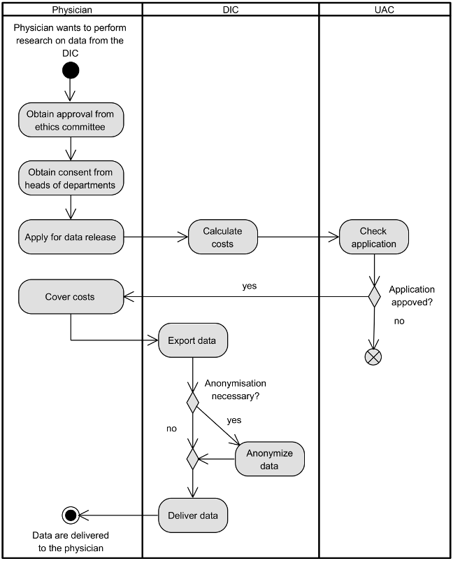 Data from a DIC can be analyzed within the data holding facility or, after an UAC voting and export, at the institution that requested the data. For cooperation with external partners for data analysis, there are two ways to ensure data privacy: either the data are covered by the broad consent [15], [16] or they are anonymized, e.g. by removing or masking identifying information, or by giving ranges containing the original data, possibly resulting in an anonymization bias [17].