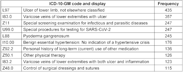 Regarding diagnoses, the ICD-10-GM codes used for billing (using SAP software) were provided. In Table 3 [Tab. 3] the ten most frequent diagnoses are shown. Four of them are wound diagnoses (L97, I83.0, L88, I83.2), two are specific codes for SARS-CoV-2 screening before admission (Z11, U99.0), two are typical codes for comorbidities (I10.00, Z92.2) and two are codes for general and wound specific treatments (Z50.1, Z48.0). In the data provided, there were no signs for anonymization.