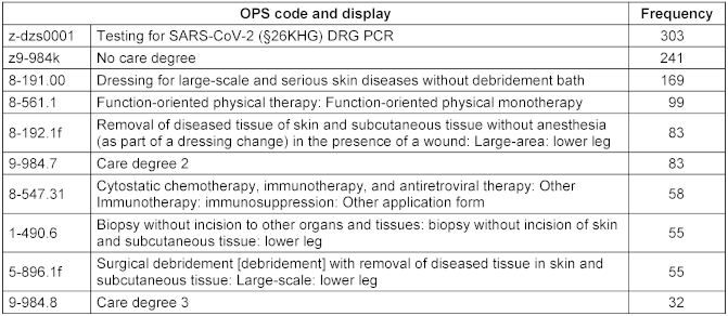 The Procedure data provided were coded with the national system of operations and procedures (OPS) [23], extended by a few local codes. The ten most frequent procedures are shown in Table 4 [Tab. 4]. Notably, testing for SARS-CoV-2 was the most frequent procedure. The care degree (either as no degree or the degree number) was also frequently documented. Four procedures (8-191.00, 8-192.1f, 1-490.6, 5-896.1f) referred to interventions concerning the wound. Similar to diagnoses, mostly billable information was captured. In total, procedures were only captured for less than two thirds of the patients (309 out of 499, 61.9%). Alike the diagnosis information, there were no signs for anonymization visible.