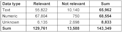 Therefore, in total, 65,962 entries contained textual results, 68,554 entries contained assumably numerical results, and 8,833 entries contained data of unknown type as neither a result nor a unit were stated.