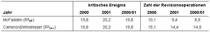 Auf dem Feld der Sozial- und Bevölkerungswissenschaften finden sich im allgemeinen deutlich kleinere R2-Werte als etwa in den Naturwissenschaften. So gesehen erweist sich die Anpassung der multivariaten Modelle zur Erklärung der Ergebnisparameter alles in allem als überraschend gut (Tabelle 13 [Tab. 13]), wobei sowohl das kritische Ereignis als auch die Zahl der Revisionsoperationen ihre höchste Anpassung im Jahr 2001 finden (letzteres nur in Bezug auf R2Dev).