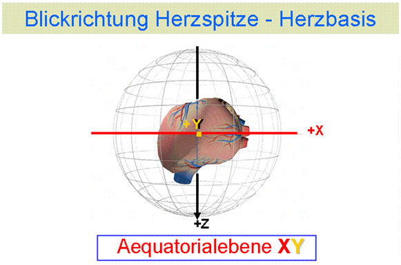 Für eine einheitliche und reproduzierbare Methodik muss ein Fixpunkt für die Anlage der Ableitungselektroden definiert werden. Die Elektrode 1 (grün) entspricht V4 nach Wilson und liegt im 5. Interkostalraum in der Medioklavikularlinie. Obwohl die anatomische Herzachse von Patient zu Patient variiert, liegen die Maximalvektoren von R und T sowie die Schlingen in guter Annäherung in der so konstruierten schrägsagittalen Herz-Hauptebene (XY-Ebene).