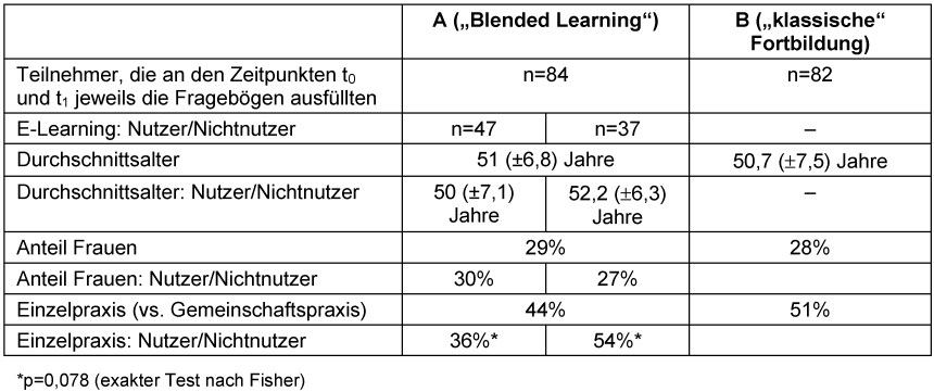 Von 84 teilnehmenden Ärzten der Gruppe A nutzten nach eigenen Angaben nur 47 (56%) die additiven E-Learning-Angebote („Nutzer“, Tabelle 2 [Tab. 2]), 37 (44%) taten dies nicht („Nicht-Nutzer“). 44 der 47 Nutzer fanden die additiven E-Learning-Angebote nützlich (zwei machten keine Angaben und ein Teilnehmer fand die zusätzlichen Angebote nicht nützlich) und beschäftigten sich im Durchschnitt 83±48 min [15–200 min] damit (retrospektive Einschätzung der Teilnehmer). Ein so genanntes User-Tracking fand aus ethischen und motivationalen Überlegungen heraus nicht statt [14], [15]. Es zeigten sich keine signifikanten Unterschiede zwischen Nutzern und Nicht-Nutzern hinsichtlich Alter, Geschlecht (Tabelle 2 [Tab. 2]) und Ausgangsdaten (t0).