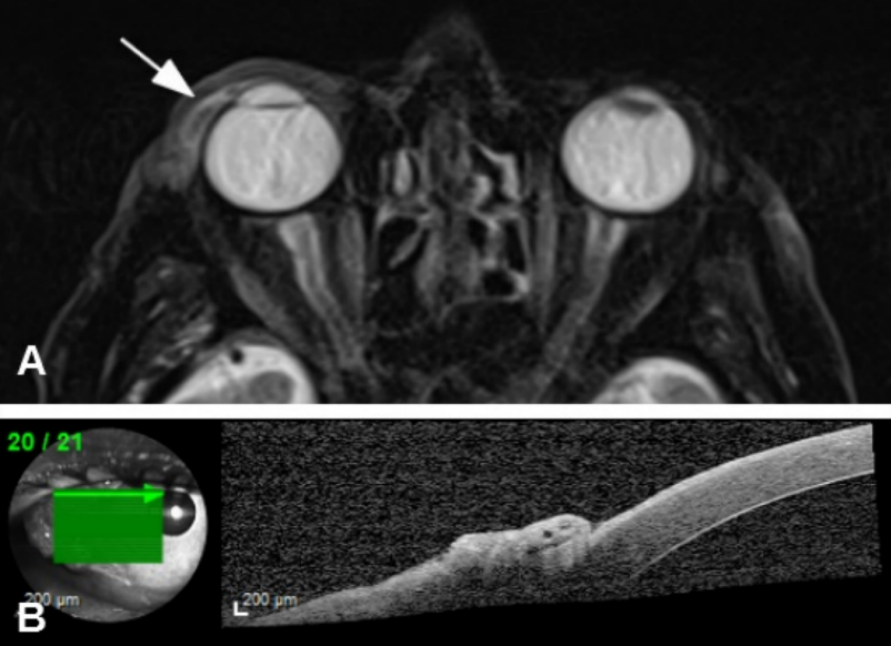 Figure 6: A) Magnetic Resonance Imaging showed lateral rectus muscle involvement. B) Anterior Segment – Optical Coherence Tomography (AS-OCT): a hyperreflective lesion involving conjunctival tissue and spread over corneal surface