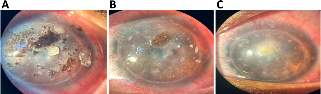 Figure 1: Clinical course and treatment response of Aspergillus niger keratitis following DALK. Blackish growth was observed under the bandage contact lens at presentation (A). Corneal ulcer with blackish growth covering the base following removal of the bandage contact lens (B). Clinical appearance one week after initiating treatment (C)