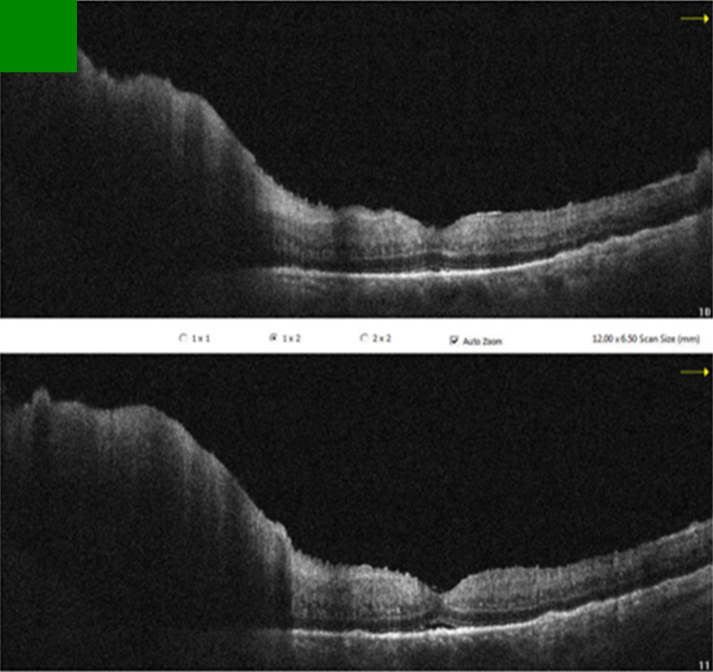 OCT revealed irregularities and multiple subretinal hyperreflective deposits at the level of the retinal pigment epithelium and Bruch’s membrane. These irregularities and deposits were predominantly observed in the left eye, accompanied by severe optic disc edema.