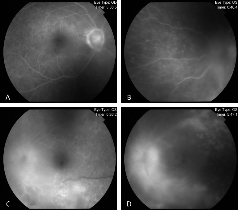 FFA exhibited indistinct granular hyperfluorescence and mild staining in the optic nerve of the right eye (A). In the left eye, FFA revealed early and dense leakage in the optic nerve, accompanied by venous segmentations, generalized granular hyperfluorescence, vasculitis, and areas of capillary dropout (B–D).
