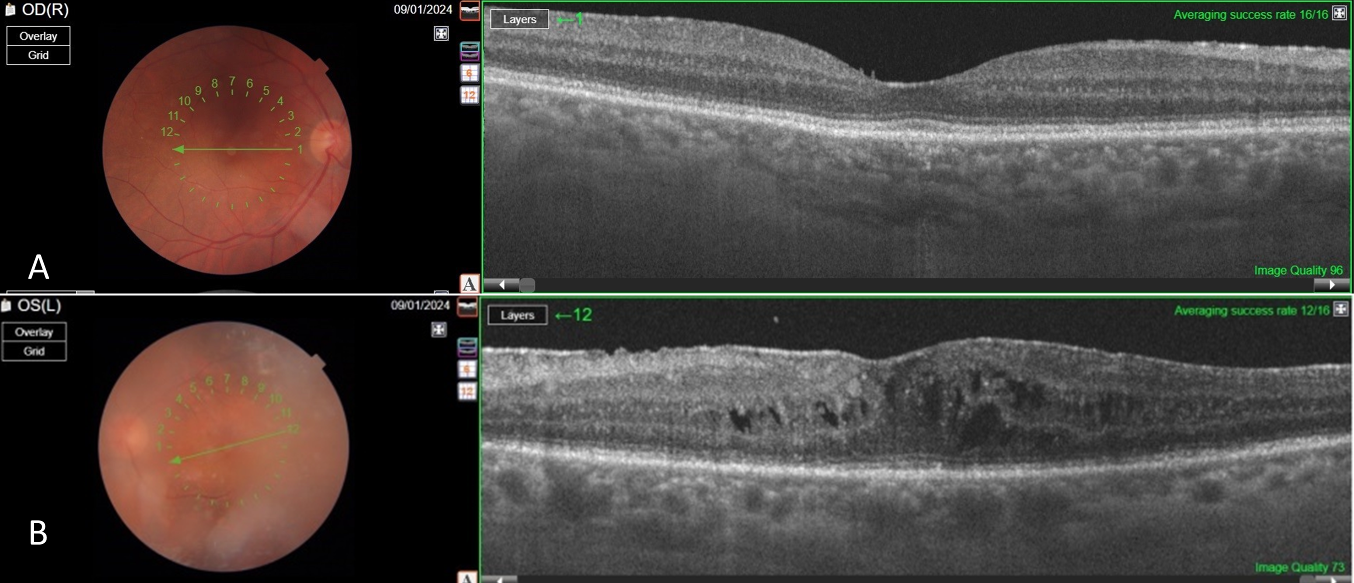 The findings regressed in both eyes compared to the pre-treatment period (A–B). However, vitreous opacity and cystoid macular edema were observed, only in the left eye (B). Additionally, an epiretinal membrane induced by bilateral vitreous inflammation was noted (A–B)