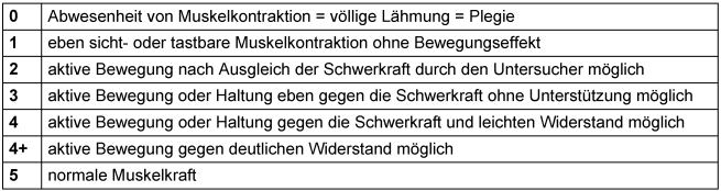 Tabelle 3: Graduierung des Kraftgrades zwischen normaler Muskelkraft und völliger Lähmung [49]