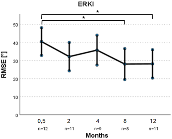 Figure 1: Root mean square error (RMSE) of sound source localization over the months. Measured using the “Erfassen des Richtungshören bei Kindern (ERKI)” system